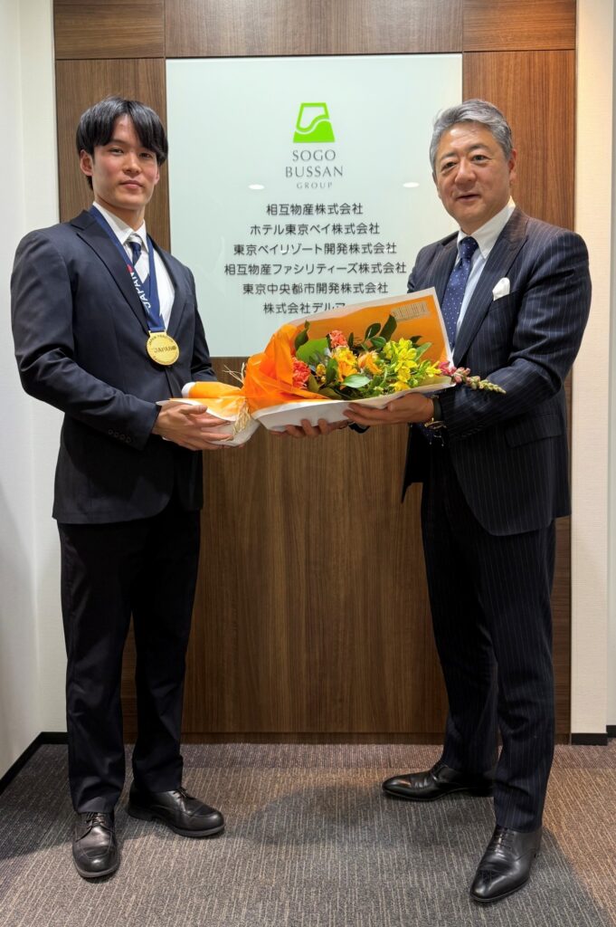 その後、相互物産グループ代表である代表取締役社長の小澤真也へ大会結果を直接報告し、同氏より栄誉を称えて花束を贈呈しました。
